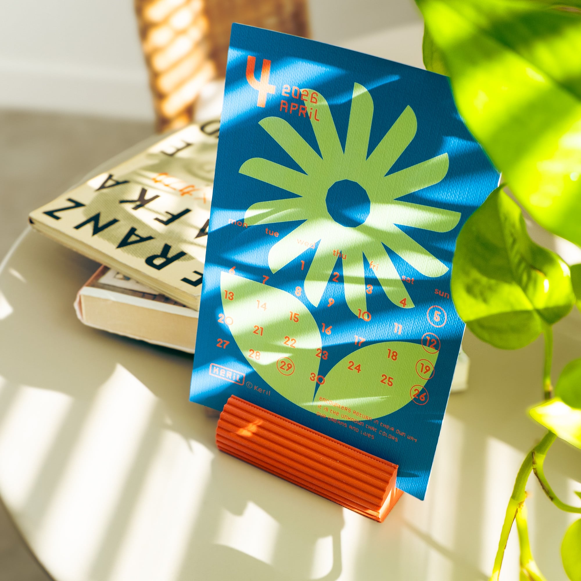 Kerilオリジナルデザインの2026-2027カレンダー。 2026年3月始まりのカレンダー。 月毎の誕生花をモチーフとしたカラフルで幾何学的なイラストと、そっと背中を押してくれるような一言メッセージを添えたデザイン。 飾るだけで空間がやわらかく彩られ、見るたびに、嬉しくなるような、少しだけ優しくなれるような、そんなカレンダーに仕上げました。 ご自宅用にはもちろん、大切な方へのギフトにもおすすめです。 スタンドは【A:ベージュ】と【B:オレンジ】をご用意しております。 ご希望のカラーをお選びください。 ※こちらの商品は【スタンド付き】の商品となります。カレンダー本体のみ購入希望の方は、別ページにて販売中の[【スタンドなし】Birth Flower Calendar 2026 - 2027]をご購入ください。 【セット内容】 カレンダー12枚+カバー1枚 【サイズ】 148 × 100mm はがきサイズ 【材質】キャンバス柄 209.3g ※3点以上お買い上げの方は、【ボックス配送】をお選びください。 ※商品写真は参考用写真です。実際の商品とは、色・形など若干異なる場合がございます。予めご了承のうえ、ご購入ください。 ※スタンドは3Dプリンタで一点ずつ制作しているため、層の模様や小さなゆがみ、小さな隙間などが生じる場合があります。ハンドメイド品特有の個体差として、あらかじめご理解いただいた上、ご購入ください。 ※スタンドは60℃以上の高温環境では変形する恐れがあります。高温多湿の場所や直射日光が当たる場所での保管はお避けください。 ※スタンドは防水仕様ではありません。水濡れにご注意ください。 ※製造の都合や輸送状況などにより入荷時期に変更がある場合は、発送時期を変更させていただく場合がございます。その場合は、当ページにて随時ご案内いたします。